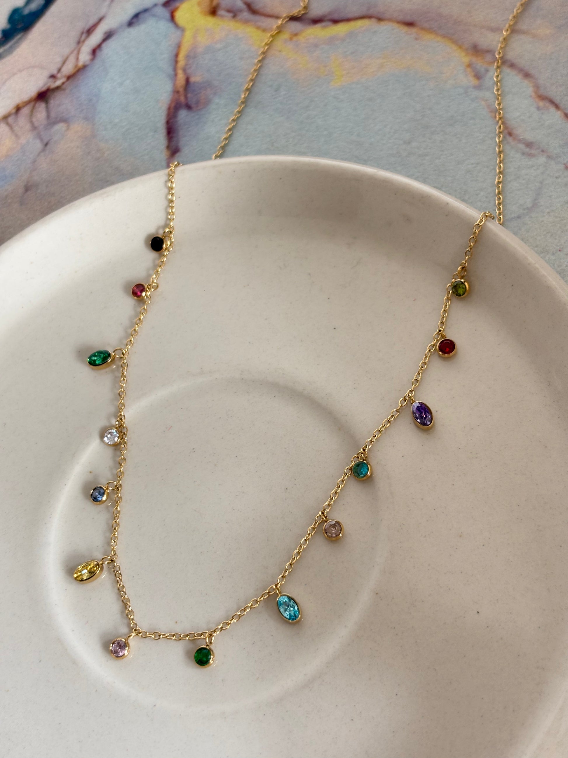 Elevate your everyday look with the Auleria Multi-studded Necklace, a playful piece that brings instant sparkle to any outfit. Featuring eye-catching multi-color drop charms that dangle gracefully, this stunning necklace combines bold style with delicate charm.