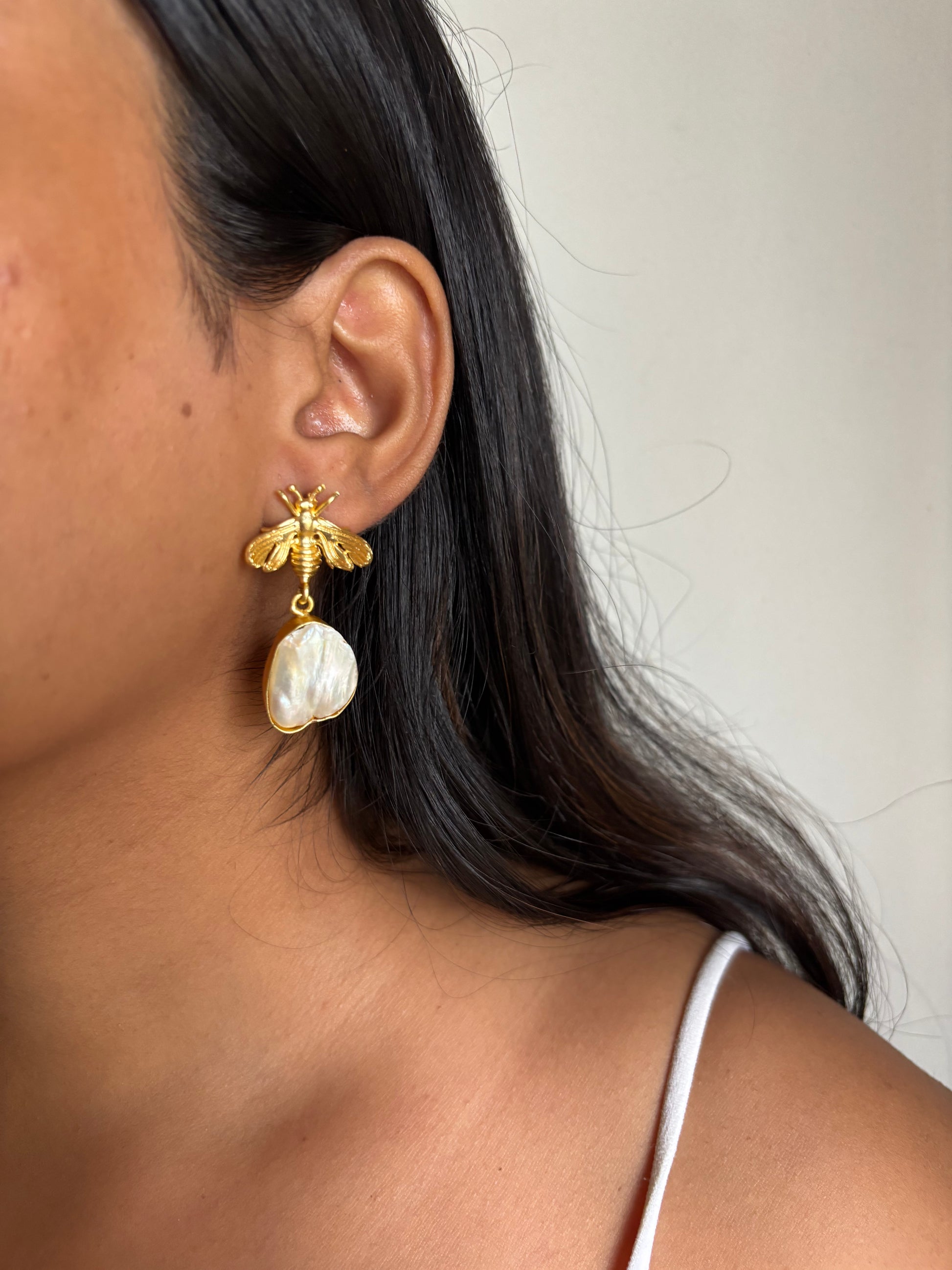 Add a touch of whimsy to your look with the Bee Baroque Pearl Dangler. Crafted from warm brass and featuring an artfully irregular pearl, this playful statement piece brings nature’s charm with a stylish twist. Perfect for those who love a little quirk in their shine!