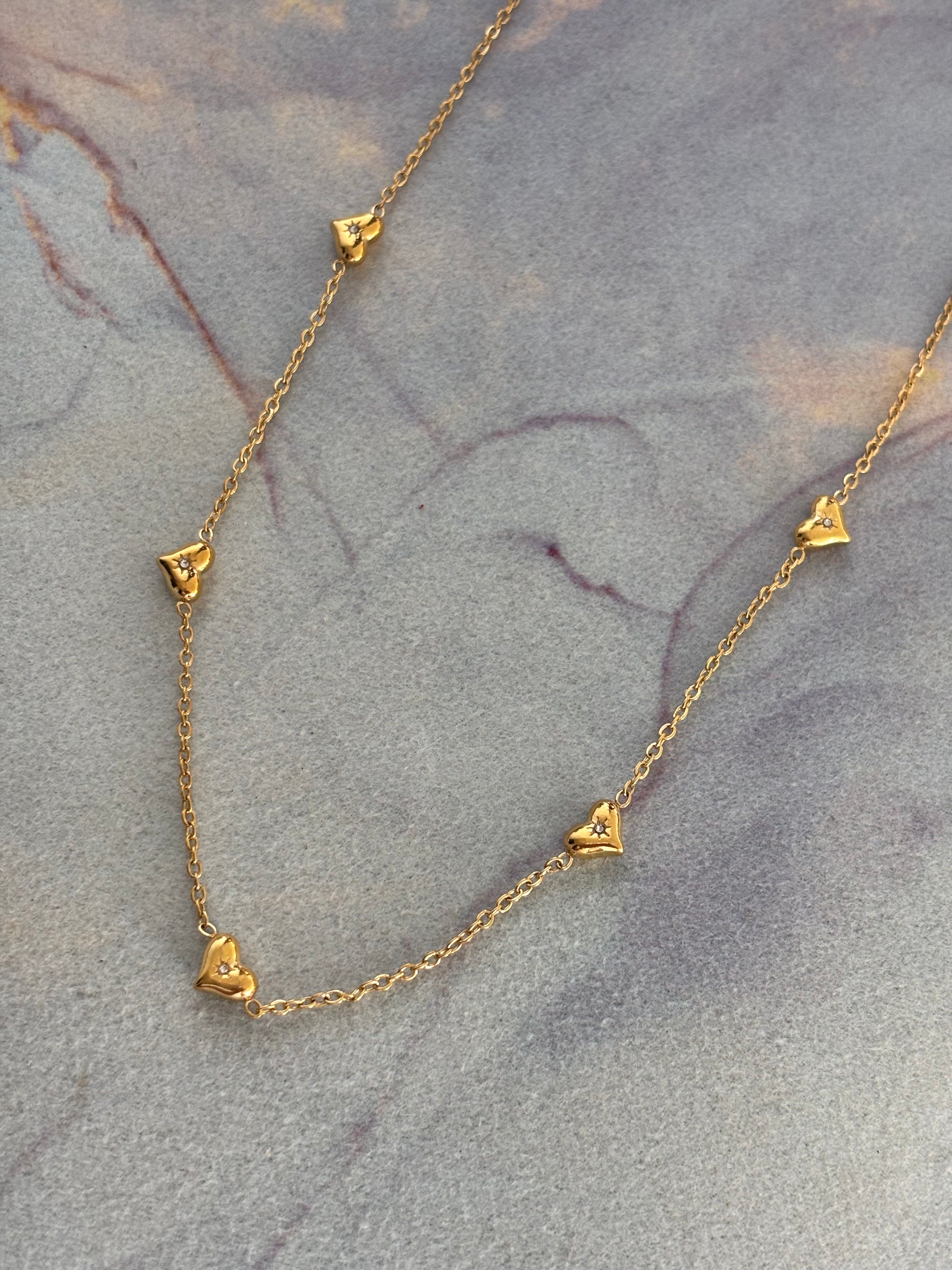 Add a dash of sparkle to your look with this playful Bling Heart Necklace. Featuring a sleek design adorned with studded heart charms, it’s the perfect accessory to brighten your day and catch every eye. Whether layered or worn solo, this necklace brings a fun, flirty vibe to any outfit.