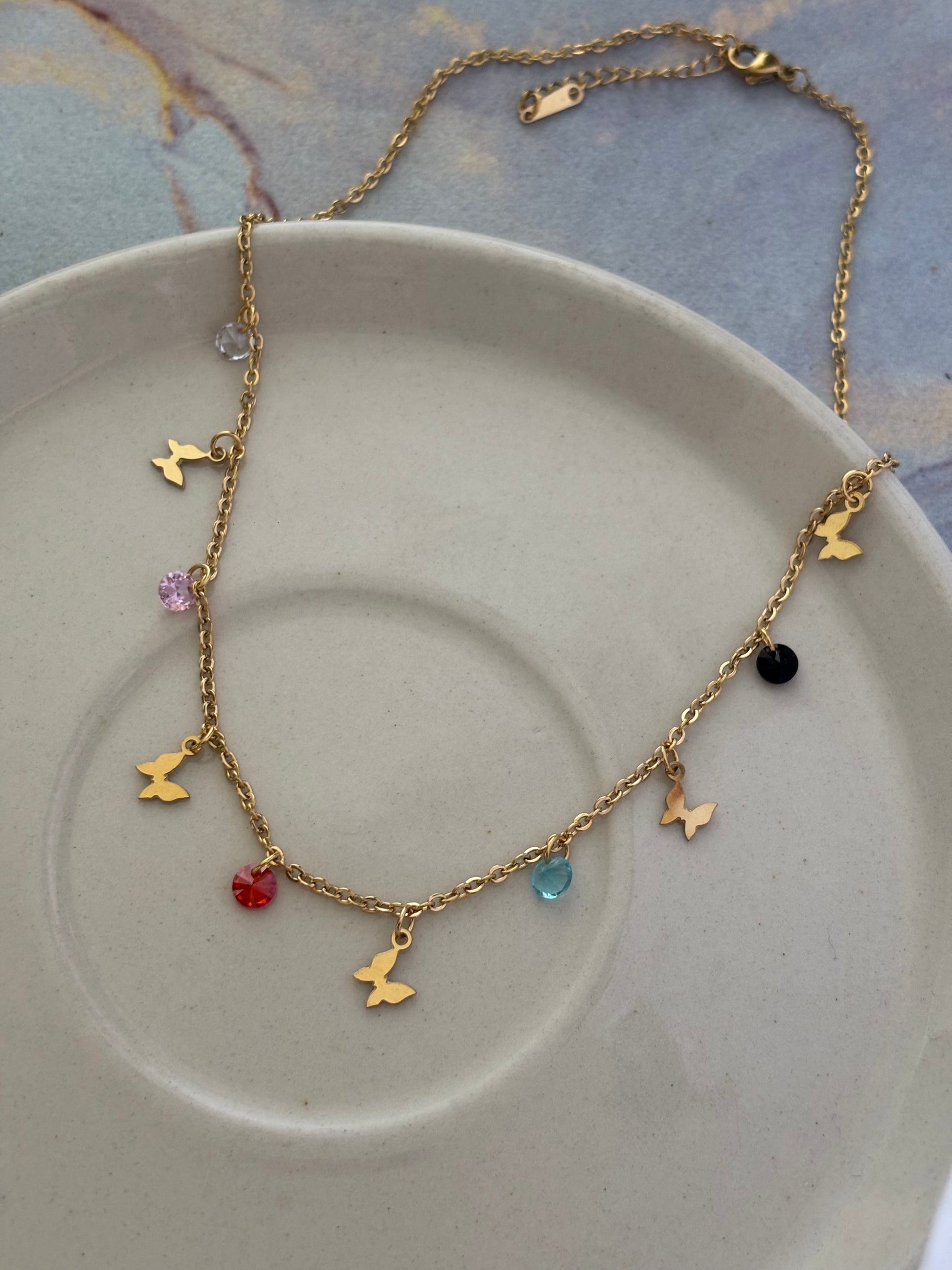 Flutter into style with our Butterfly Multicolor Charm Necklace! This delicate piece features a beautiful butterfly design adorned with vibrant colors.