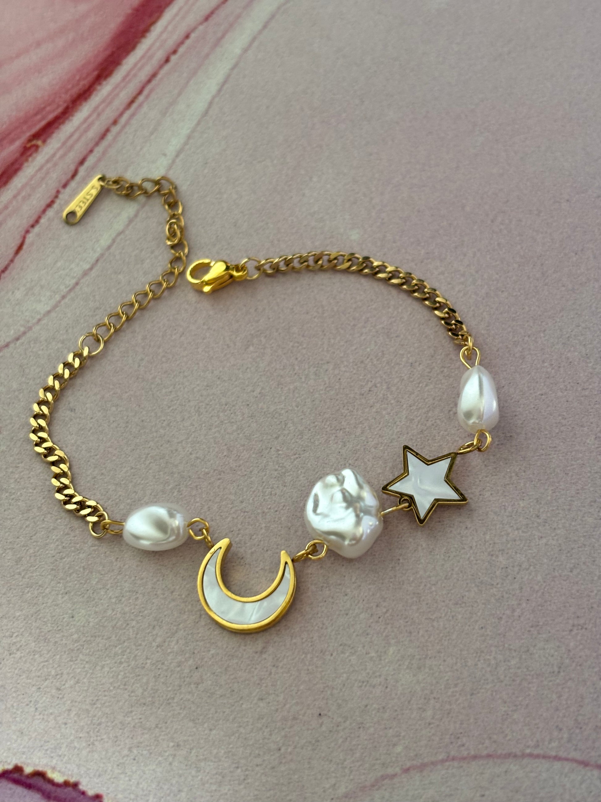 Capture the celestial beauty of the night sky with our Celestial-pearl Bracelet. Adorned with a charming moon and star charm, and lustrous pearls.