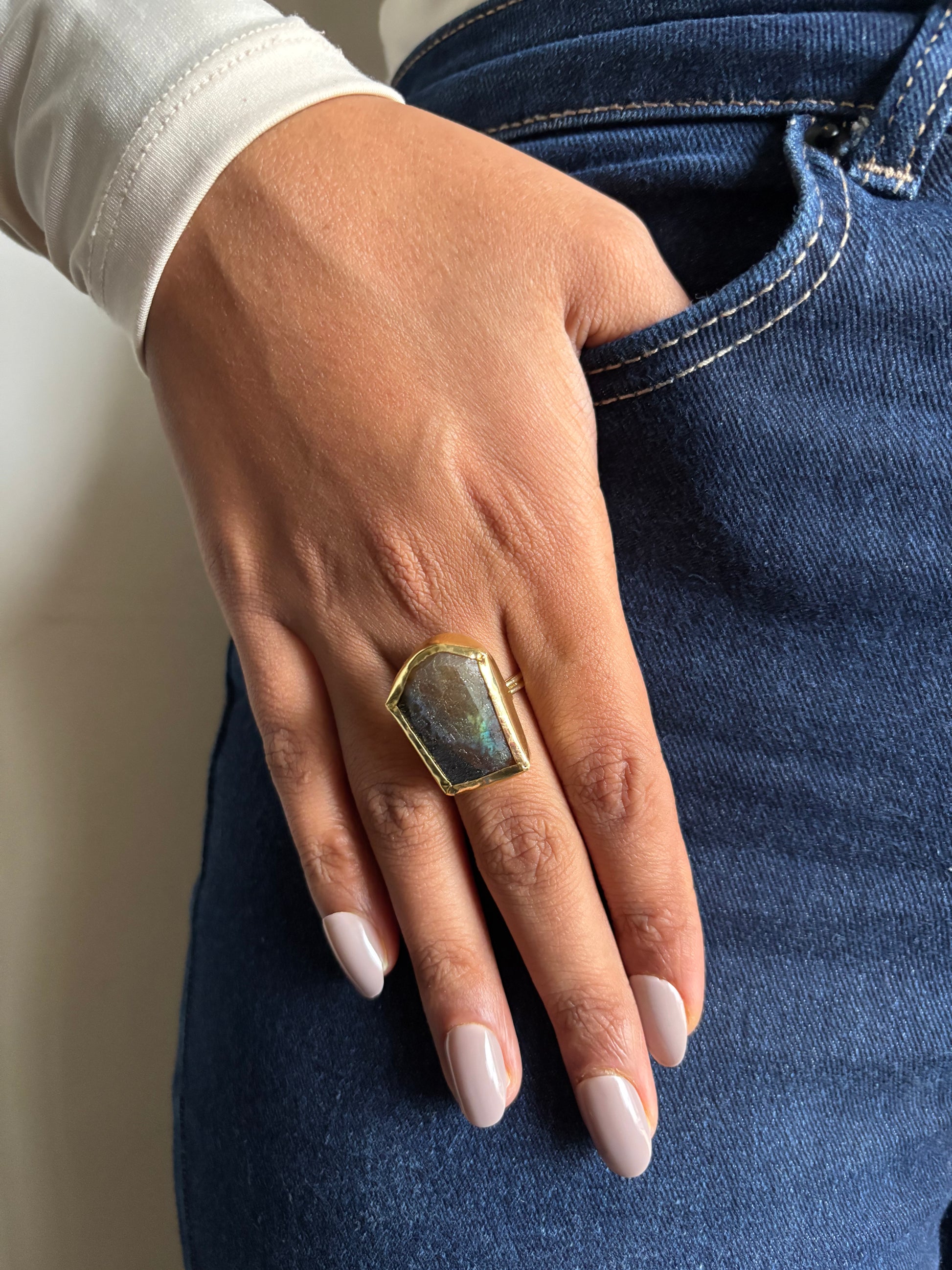 Add a touch of bold charm with this Charcoal Radiant Adjustable Ring crafted from warm brass. Its unique stone centerpiece mimics the smoky allure of charcoal, making each piece as one-of-a-kind as you are. Adjustable for the perfect fit, this ring effortlessly blends edgy style with playful sophistication. Wear your spark of originality wherever you go!