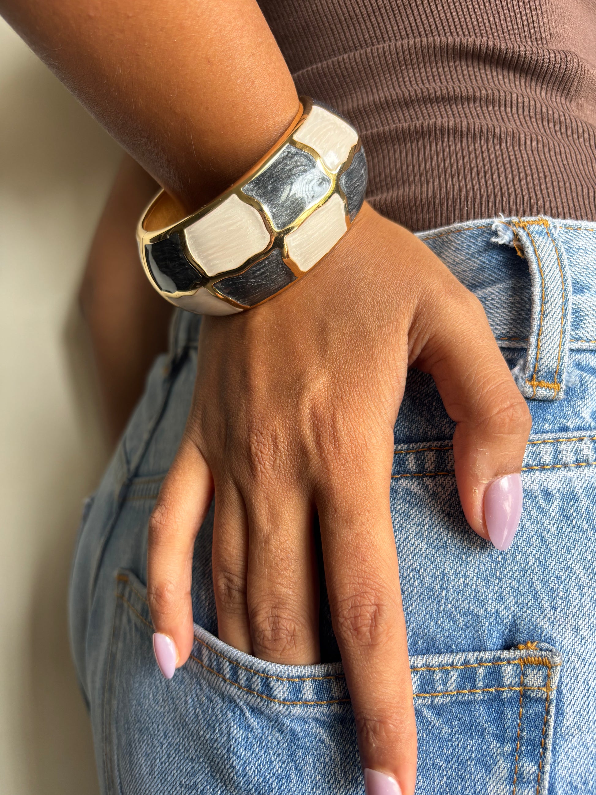 Make a bold statement with the Chunky Checkmate Grey Bangle crafted from brass. Its eye-catching, chunky design adds a trendy edge to any outfit, perfect for those who love to slay with standout accessories.