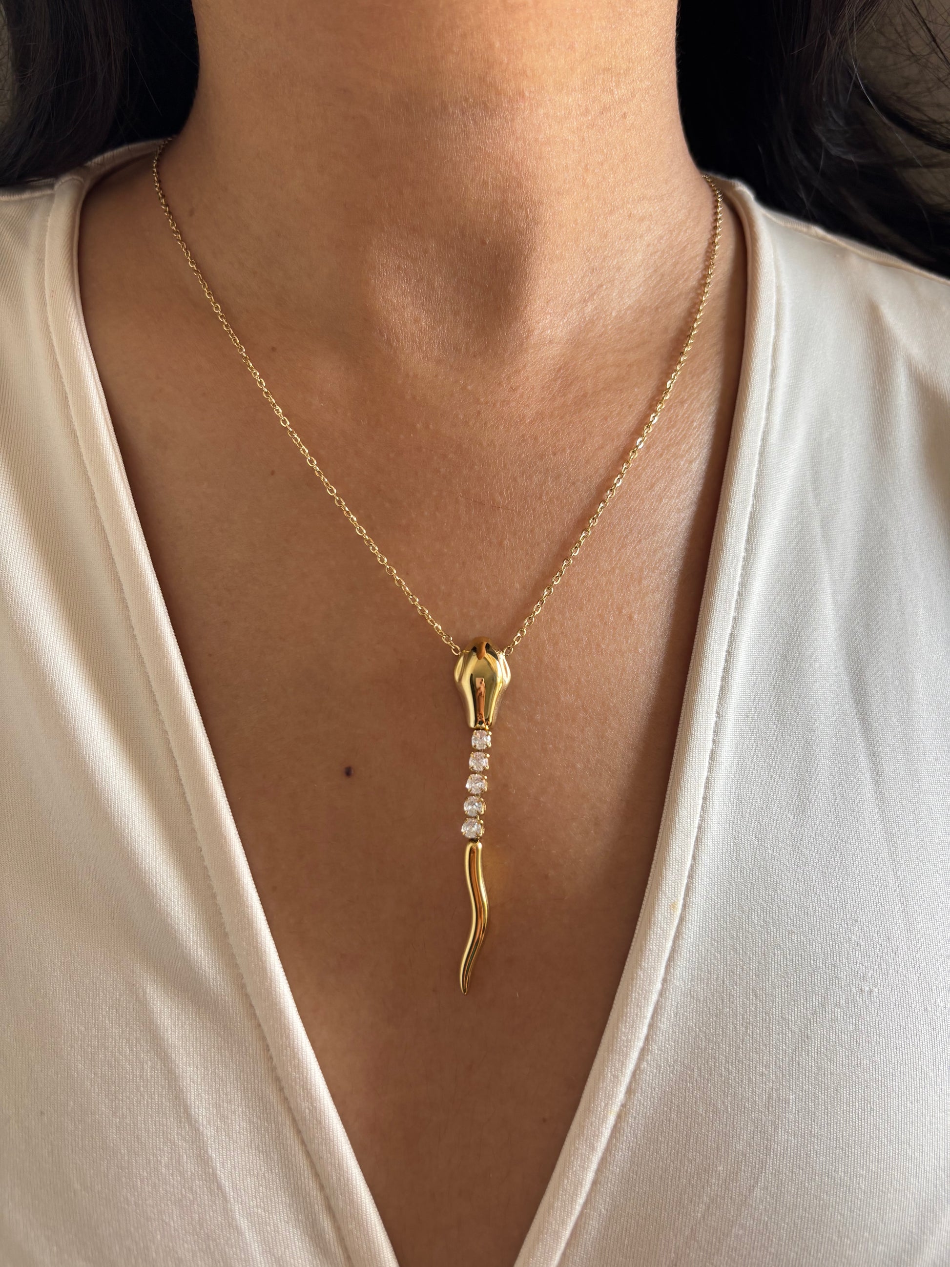 Add a twist to your style with the Swirl Studded Snake Necklace. This playful piece wraps bold studs around a sleek serpent design, making it the perfect accessory to slither into any outfit. Eye-catching and unique, it’s ready to bring a little edge and fun wherever you go.